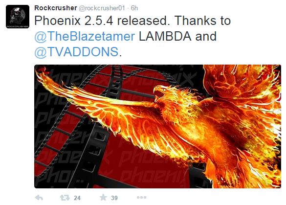 Phoenix 2.5.4 Addon released Kodi Isengard Phoenix 2.5.4 released. Thanks to @TheBlazetamer LAMBDA and @TVADDONS. This is what Rockcrusher01 Twitters says. Rockcrusher01 has been around from the Mashup days. Posting great quiality Tv to the Addon. The updated should be automatic if you have their repo. so stay tuned for the latest on… Continue reading Phoenix 2.5.4 Addon released Kodi Isengard